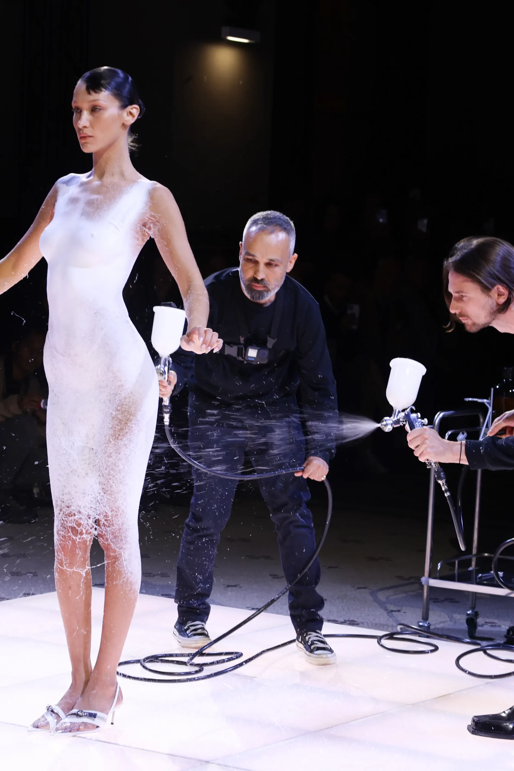 Au défilé Coperni, Bella Hadid crée la surprise dans une robe peinte en direct sur son corps